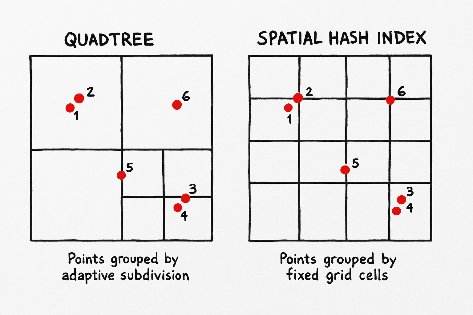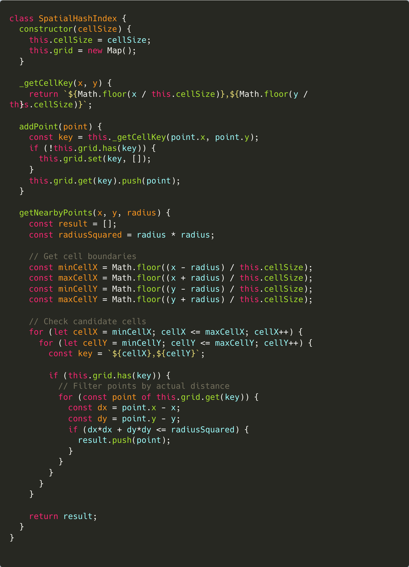 There are many variants of this basic data structure for different types of objects, but they all look pretty similar. We’re basically just creating “buckets” with spatial hashes and filling them with any object that is contained within the cell represented by the spatial hash.