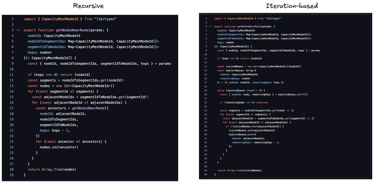 The iteration-based implementation is much faster because it keeps a set of visitedNodes and checks nodes prior to exploration. You can do this with recursive functions, but you have to pass around a mutable object and do other unnatural things. It’s just best to avoid recursive functions when writing performant code.