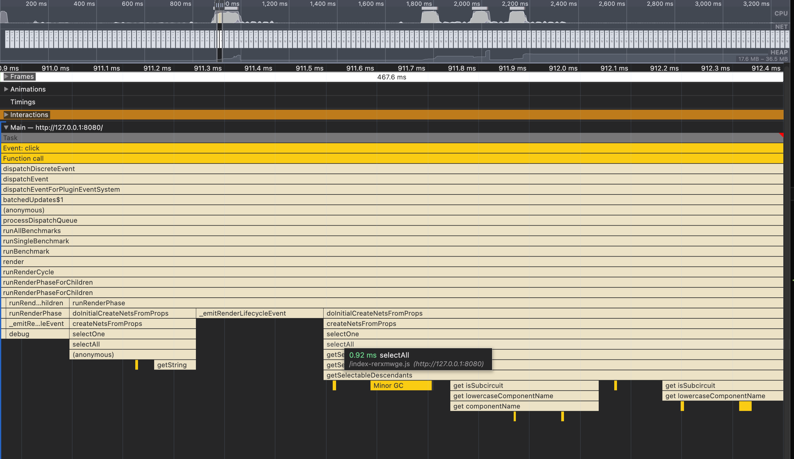 Javascript profiling tools are incredibe, you can easily see the exact total time in ms spend on each line of code. You don’t need to use any performance framework, just execute your javascript in the browser and pull up the performance tab. There are also awesome features like flame charts and stuff for memory usage.