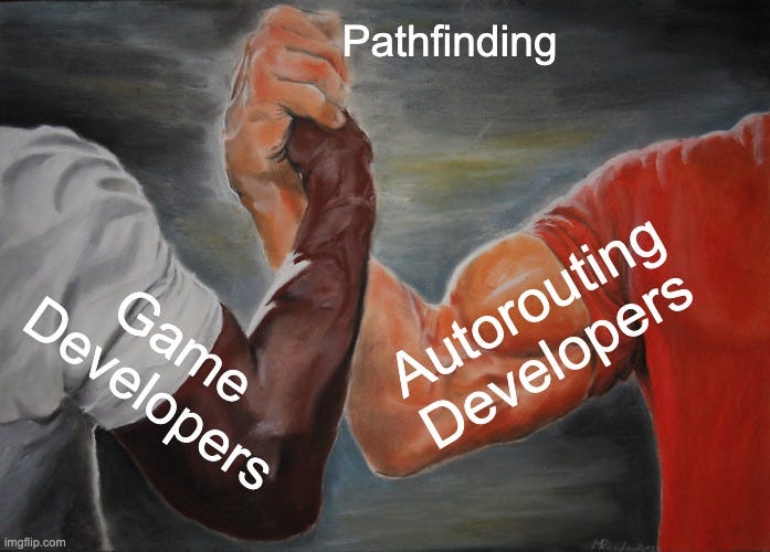 Game developers “pre-bake” navigation meshes into many gigabytes for their games. LLMs compress the entire internet into weights for search. The next generation of autorouters will spatially partition their problems, then call upon a massive cache for pre-solved solutions. The speed of the algorithm doesn’t matter when you have a massive cache with 99% of the autorouting problem pre-solved.
