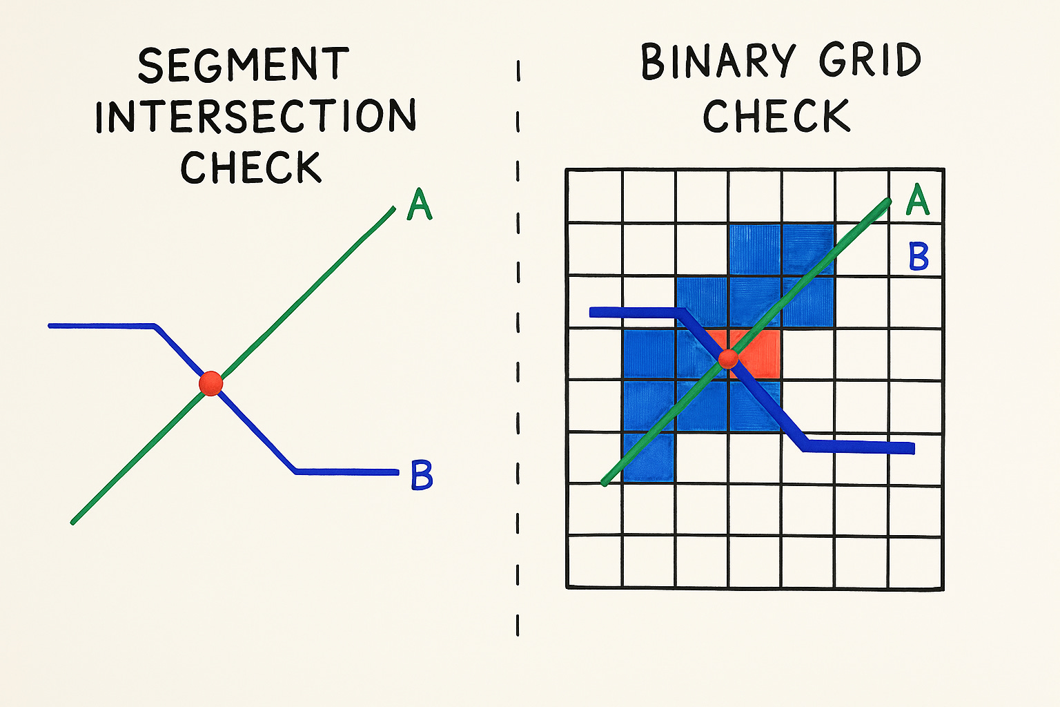 Technically, you should use “segment to segment” distance to ensure appropriate margins, which is slightly more complex than intersection, but not by much