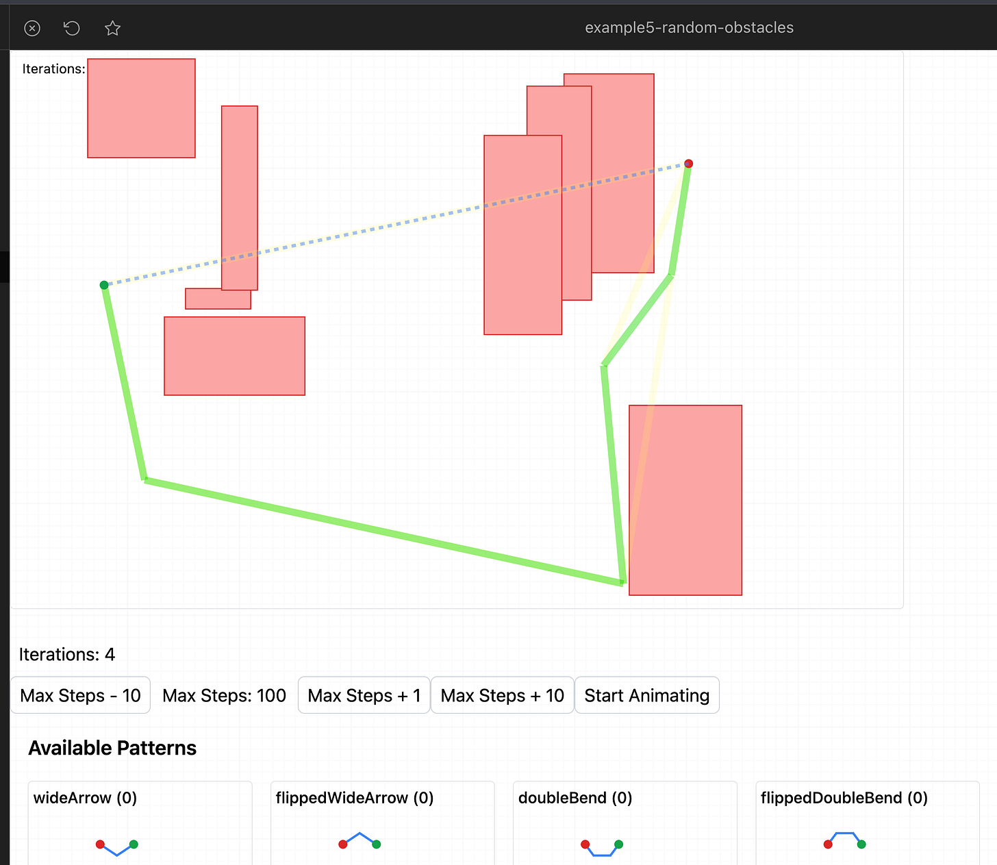 To do this, we just write an algorithm that says “whenever there is an intersection with an obstacle, take the segment that ran into the obstacle and try to replace it with any of the predefined patterns”